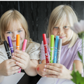 12 kappaletta erivärisiä hyvälaatuisia ja turvallisia Muumi-huopakyniä jumbo-koossa. Myrkytön väri ja kestävä kärki.