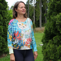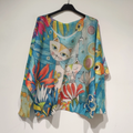 - Sukella värien ja mielikuvituksen maailmaan tällä ainutlaatuisella Taiteelliset Kissat -puserolla. Tämä väljä ja mukava tunika on todellinen katseenvangitsija, jossa eloisat kissahahmot seikkailevat satumaisessa kukkamaisemassa. Syvän sinisen pohjan päälle maalatut sävyt – oranssin, turkoosin ja pinkin vivahteet – luovat abstraktin, unelmanomaisen tunnelman. Rennon mallin ja väljien hihojen ansiosta pusero sopii täydellisesti niin arkeen kuin rennompiin juhlahetkiinkin. Se on täydellinen valinta sinulle, joka haluat ilmaista persoonallisuuttasi ja tuoda iloa pukeutumiseesi.