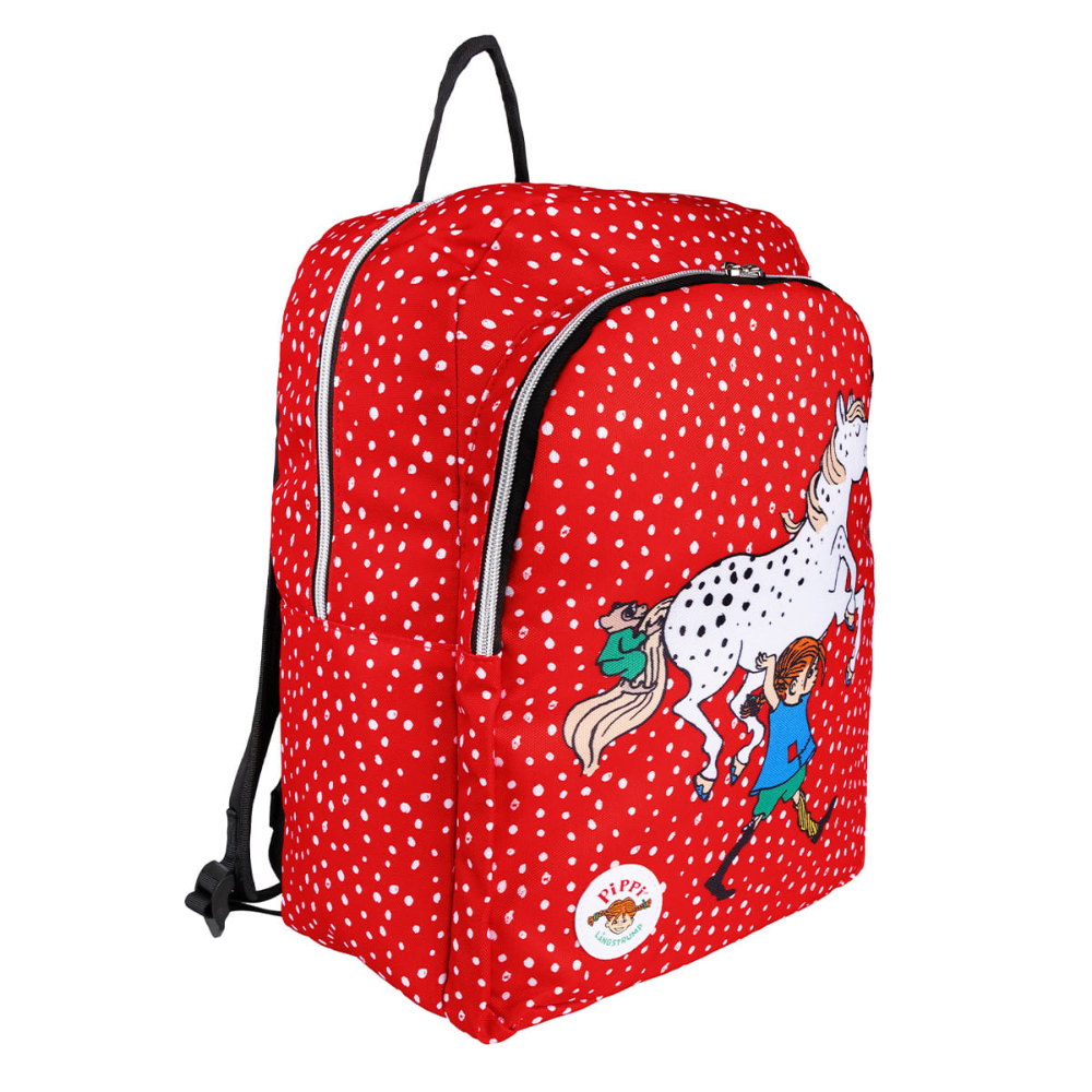 Iloisen punainen reppu valkoisilla pilkuilla, jossa Peppi Pitkätossu kantaa ystäväänsä Pikku-Ukkoa. Tämä tilava ja monikäyttöinen reppu sopii mainiosti kerhoon, eskariin tai kouluun ja vapaa-aikaan. Pehmustetut olkahihnat ja selkäosa tekevät käytöstä miellyttävää.
