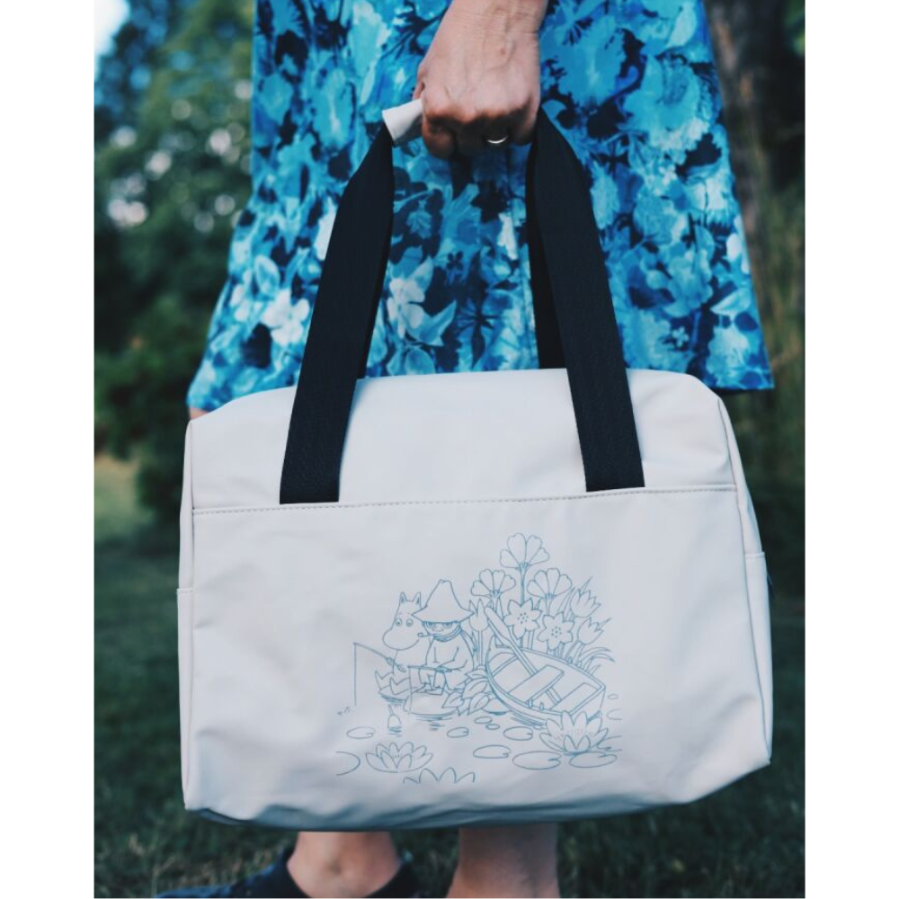 Tämä tyylikäs ja käytännöllinen viikonloppukassi on valmistettu laadukkaasta keinonahasta. Sen 35 litran tilavuus tarjoaa runsaasti tilaa kaikille tarpeellisille tavaroillesi. Kassin sivuilla on heijastava Muumi-printti ja vetimissä on heijastava Luminary - Moomin -logo, mikä lisää turvallisuuttasi hämärässä. Sisällä on pieni vetoketjullinen tasku arvotavaroille. Kassi on varustettu tukevilla kantokahvoilla ja irrotettavalla, säädettävällä olkahihnalla.