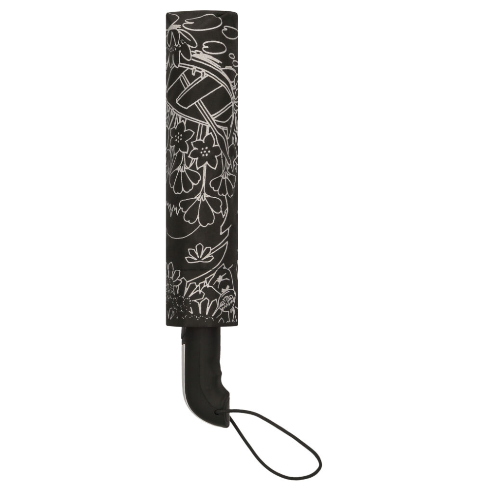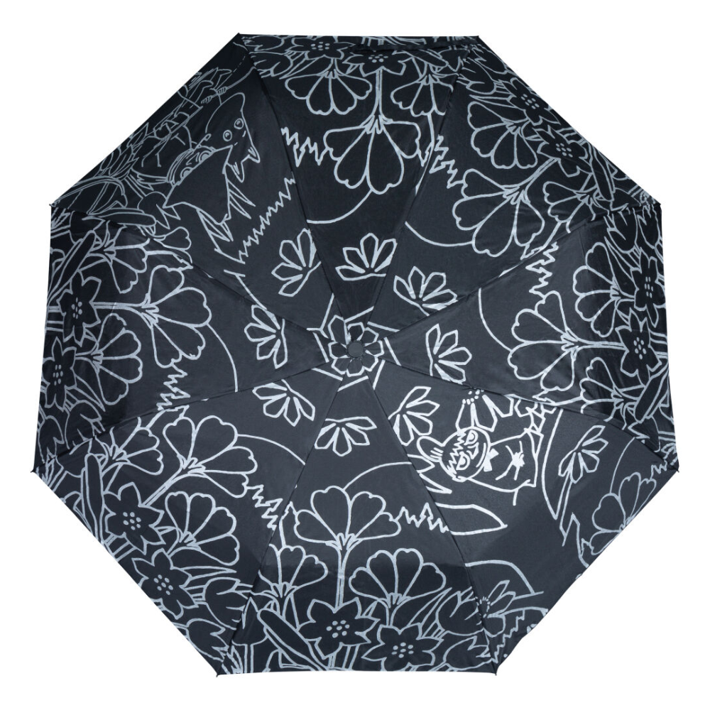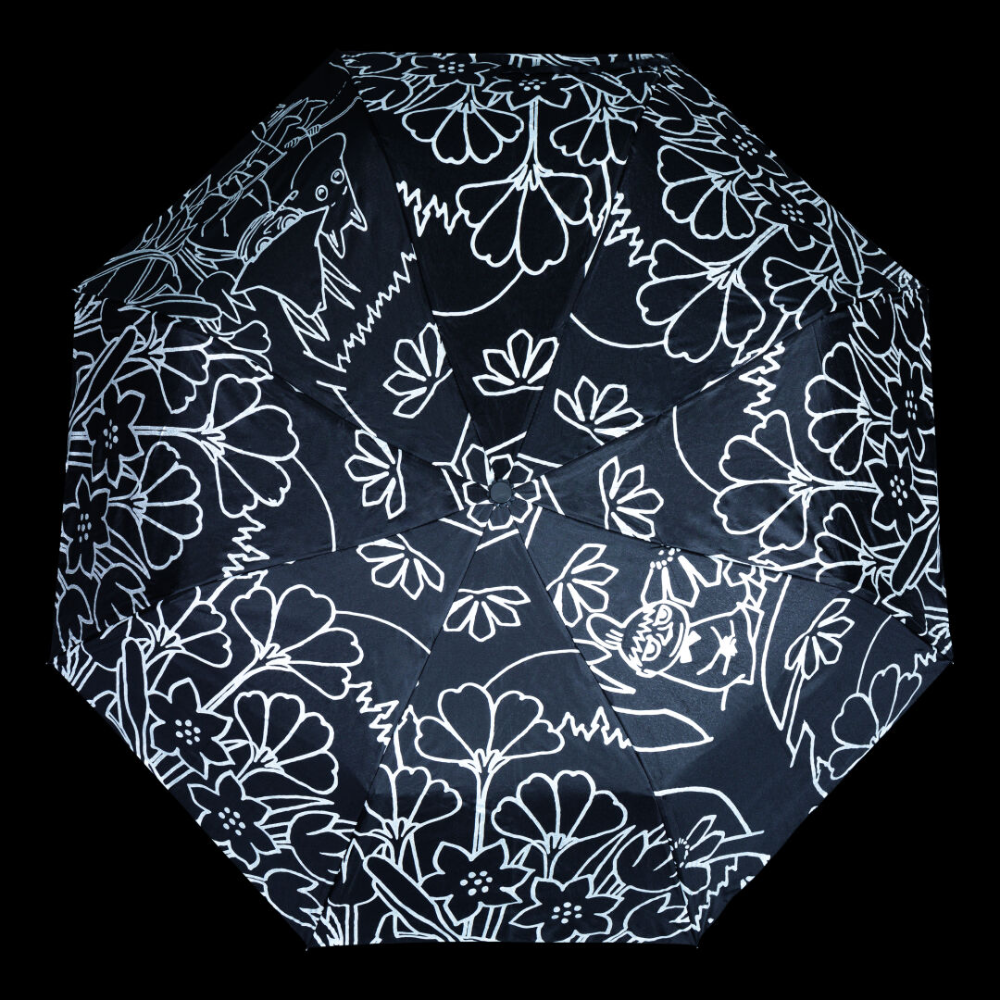 Tämä kasaanmenevä sateenvarjo on sekä tyylikäs että käytännöllinen kumppani sateisiin päiviin. Sen heijastava Muumi-kuvio ei ainoastaan lisää persoonallisuutta, vaan myös parantaa turvallisuuttasi hämärässä. Kevyt ja kompakti muotoilu tekee siitä täydellisen lisän laukkuun, kun sää yllättää. Varjo avautuu ja sulkeutuu näppärästi napin painalluksella, joten sen käyttö on vaivatonta. Yksi paneeleista esittää Pikku Myytä puun oksalla ja toisessa seikkailevat Muumipeikko ja Nuuskamuikkunen kalassa, tuoden ripauksen Muumilaakson lumoa arkeen.