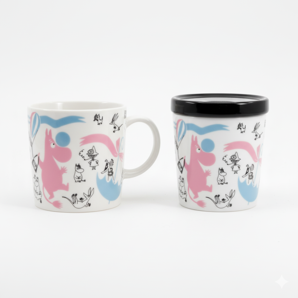 Vaaleanpunainen Muumipeikko, Niiskuneiti ja Pikku Myy seikkailevat ilmapallojen ja nauhojen keskellä, tuoden arkeen ripauksen iloa. Purnukka on paitsi kaunis keräilykohde, myös käytännöllinen säilytysratkaisu keittiöön tai mihin tahansa huoneeseen. Sen posliinikansi suojaa sisältöä tyylikkäästi. Purnukka sopii täydellisesti pikkuesineiden, makeisten tai vaikkapa kauneustuotteiden säilytykseen. Tuote julkaistiin vuonna 2017 ja oli myynnissä Stockmannin tavarataloissa. Täydellinen lahja itselle tai ystävälle, joka arvostaa suomalaista designia ja rakastettuja Muumihahmoja.