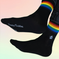 Nämä mustat retrosukat tuovat ripauksen nostalgista charmia asuusi. Sukkien yläosassa on iloinen sateenkaariraita, joka luo kauniin kontrastin ja antaa niille klassisen sporttisen ilmeen. Toisessa sukan varressa on suloinen, pieni kirjailtu kuva Muumi-tarinoista tutusta Möröstä, joka tuo tuotteeseen persoonallisen ja hienovaraisen yksityiskohdan.