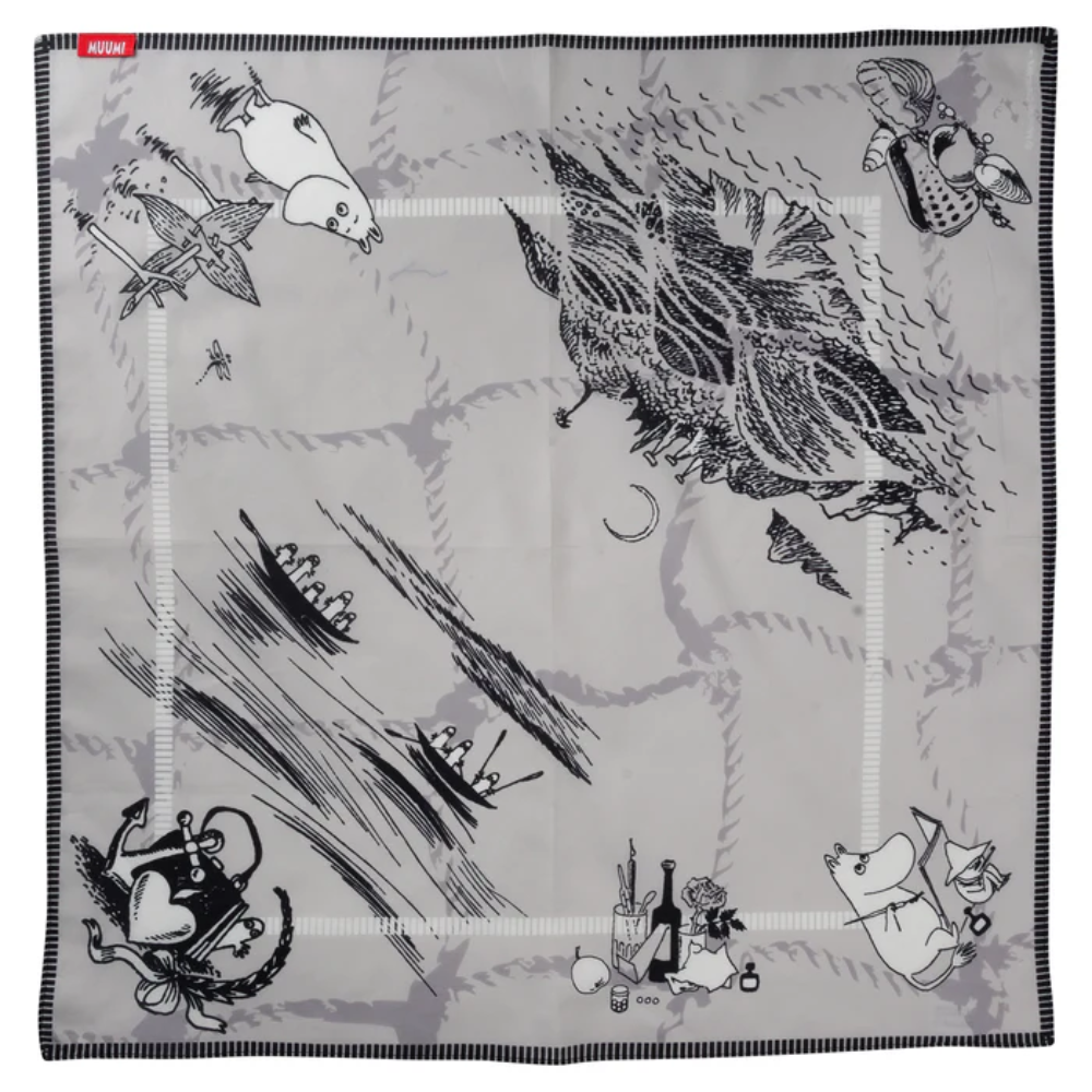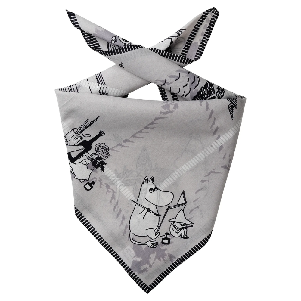 Pehmeä Muumi Meriseikkailu -bandana tuo iloa asusteisiisi. Se on täydellinen monikäyttöinen asuste, joka suojaa kaulaa tai päätä auringolta kesällä ja antaa lisälämpöä viileällä säällä. Voit käyttää huivia klassisena kaulahuivina, hiuspantana tai laukkuun solmittuna koristeena. Kuvitus perustuu Tove Janssonin alkuperäisiin piirroksiin, ja Lasessorin Design from Finland -merkki takaa tuotteen korkean laadun ja suomalaisen muotoilun.