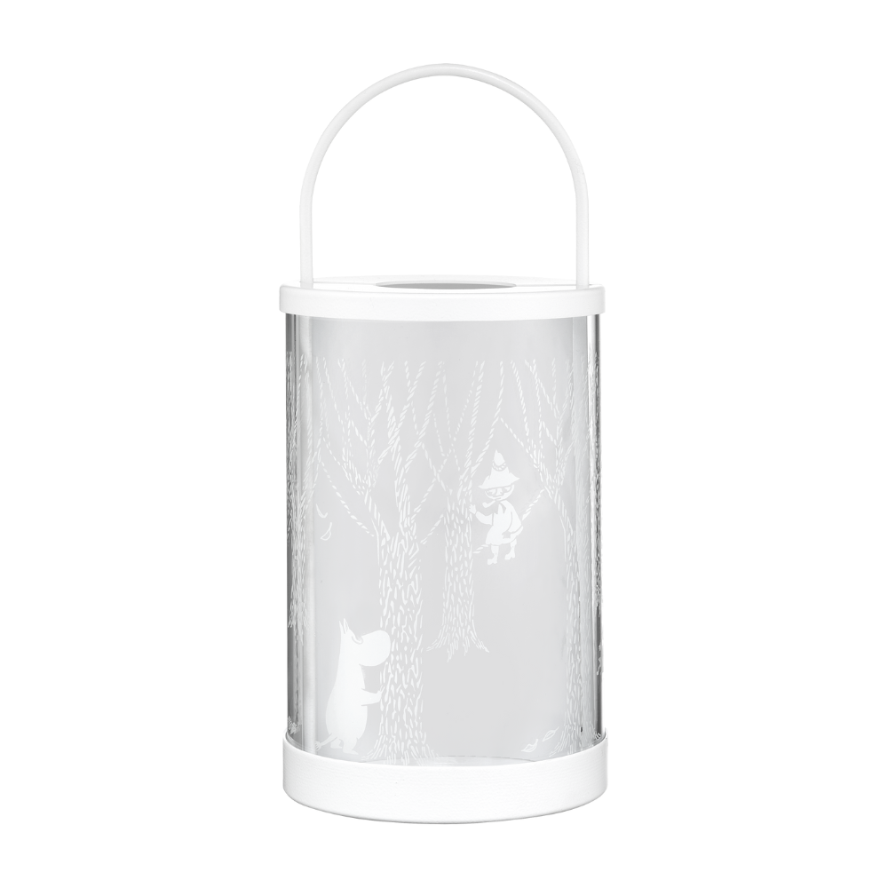 Luo tunnelmaa niin sisälle kuin uloskin! Tämä Muurlan tyylikäs kynttilälyhty vie sinut Muumilaakson hiljalleen talveen vaihtuvaan metsään. Lyhdyn sylinterinmuotoisessa lasiosassa näkyy herkkä valkoinen kuvitus Muumipeikosta ja Nuuskamuikkusesta puiden lomassa, luoden kauniin ja rauhallisen tunnelman. Lyhty on tehty kestävästä lasista ja siinä on tukeva metallirunko sekä kätevä kahva, minkä ansiosta se sopii erinomaisesti niin olohuoneen sisustukseen kuin terassille tai parvekkeelle. Sytytä sisälle kynttilä ja anna talvisen kuuran innoittaman kuvituksen luoda kotiisi lämmin valo ja mielenrauha.