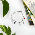 Tämä House of Disasterin Muumiperhe-riipusrannekoru tuo ajattoman elegantin ja samalla persoonallisen yksityiskohdan asuusi. Rannekorussa on hopeanvärinen ketju ja viisi erilaista, emaloitua riipusta, jotka esittävät rakastettuja Muumihahmoja ja Muumitaloa. Jokainen riipus on kaunis ja värikäs pieni taideteos.