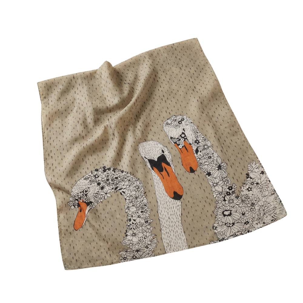 Tämä upea ja kevyt House of Disaster -huivi on täydellinen asuste tyylitietoiselle naiselle, joka arvostaa uniikkeja yksityiskohtia. Huivin harmahtavalla pohjalla koreilee kolme eleganttia joutsenta, joiden höyhenpuku on viimeistelty kauniilla kukkakuvioinnilla. Joutsenten oranssit nokat tuovat pirteän väripilkun hillittyyn kokonaisuuteen. Ohut ja pehmeä materiaali laskeutuu kauniisti, tehden siitä monikäyttöisen asusteen niin arkeen kuin juhlavampiinkin tilaisuuksiin.
