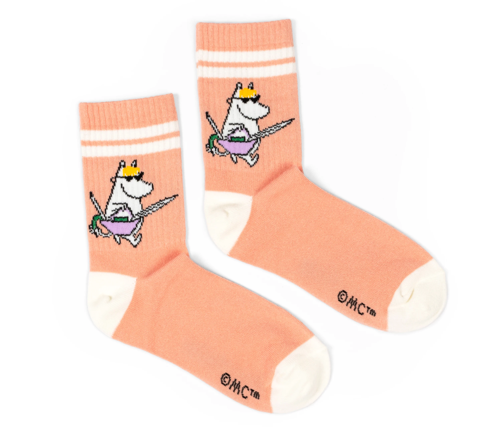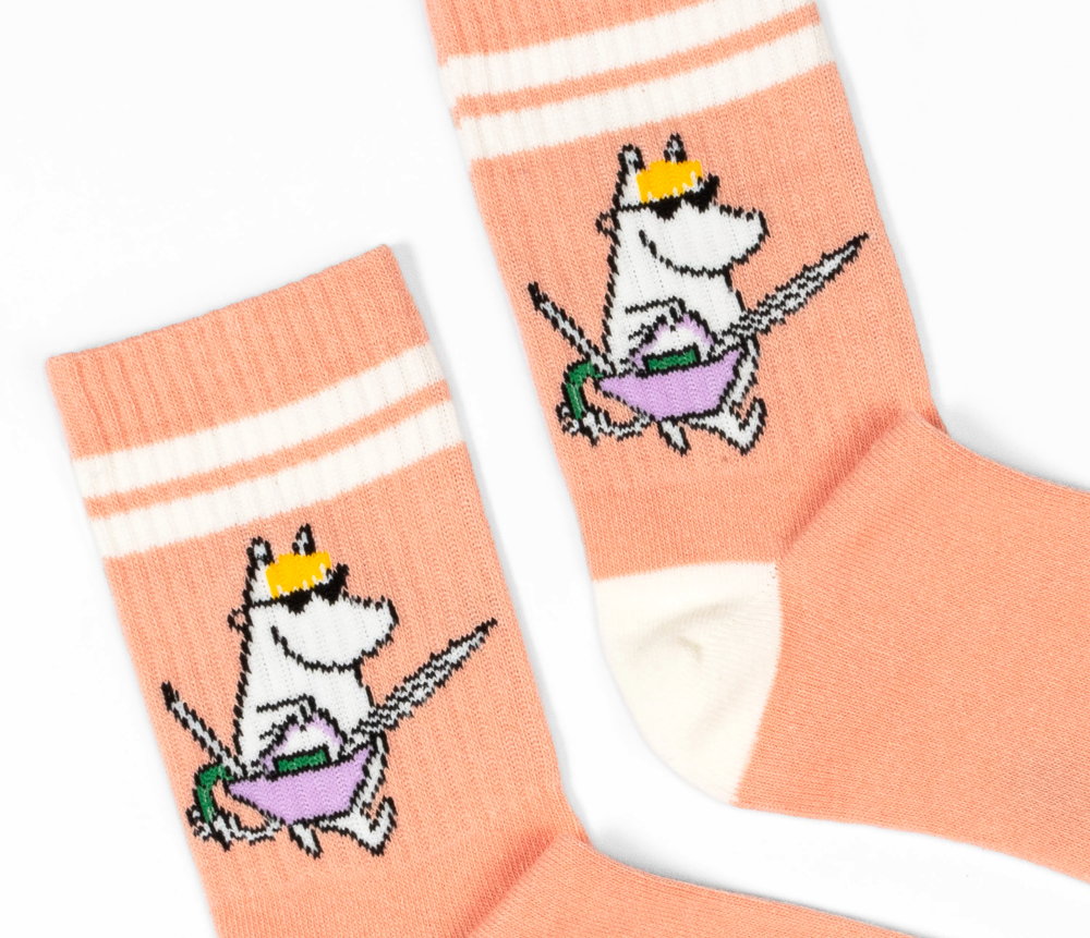 Suloinen Niiskuneiti persikan sävyisissä sukissa, ilahduttaa kaikkia Muumi-faneja.