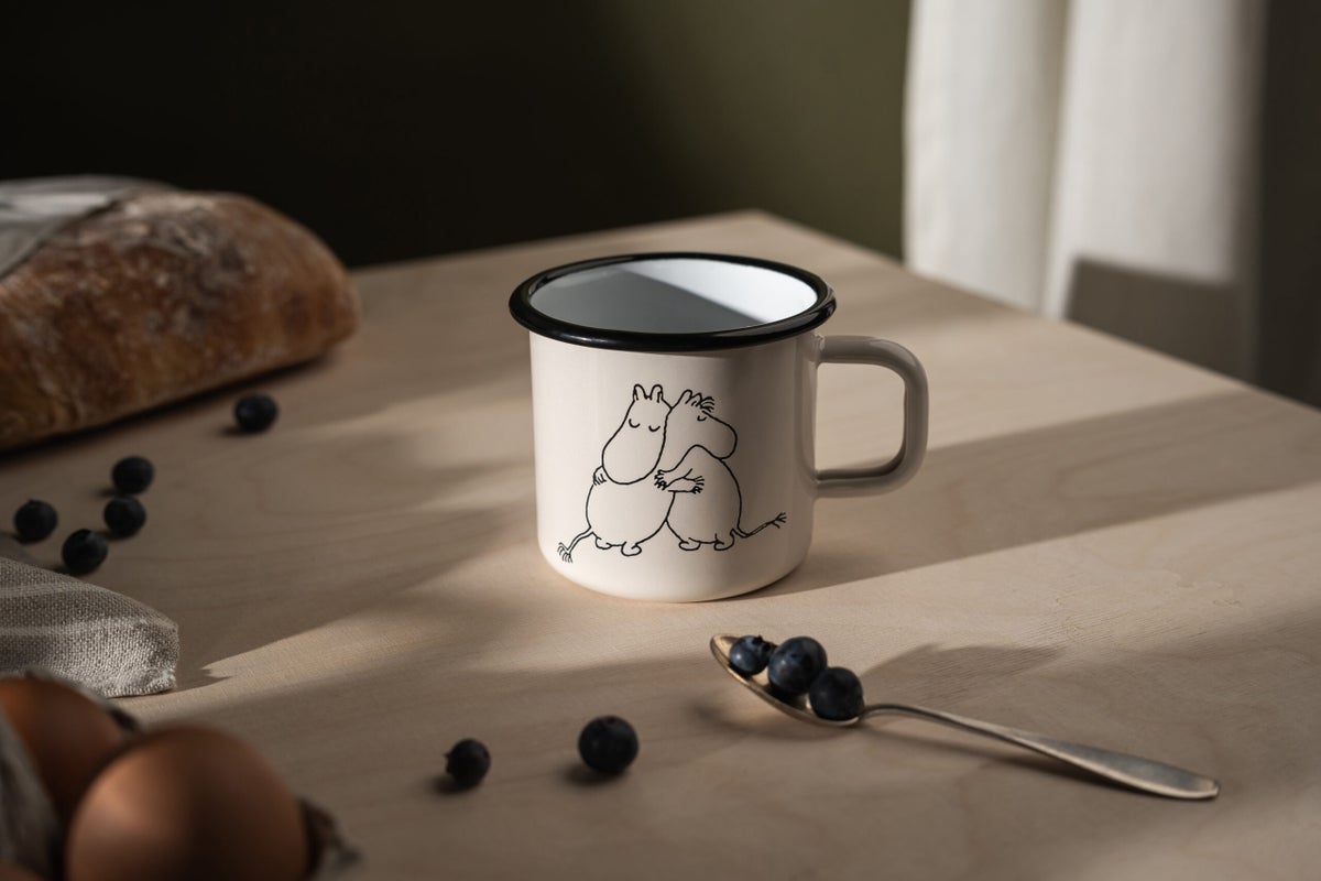Hempeästä Muumi 80 emalimukista nautit niin lämpimät kuin kylmätkin juomat. Muurlan emalituotteiden sydän on hiiliterästä, jonka päällä on kaksinkertainen emalointi. Muki on kevyt ja kestävä ja se soveltuu perinteisten kattauksien lisäksi myös ulkokäyttöön.