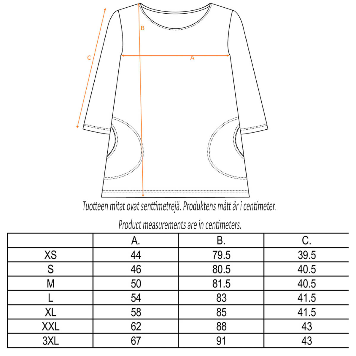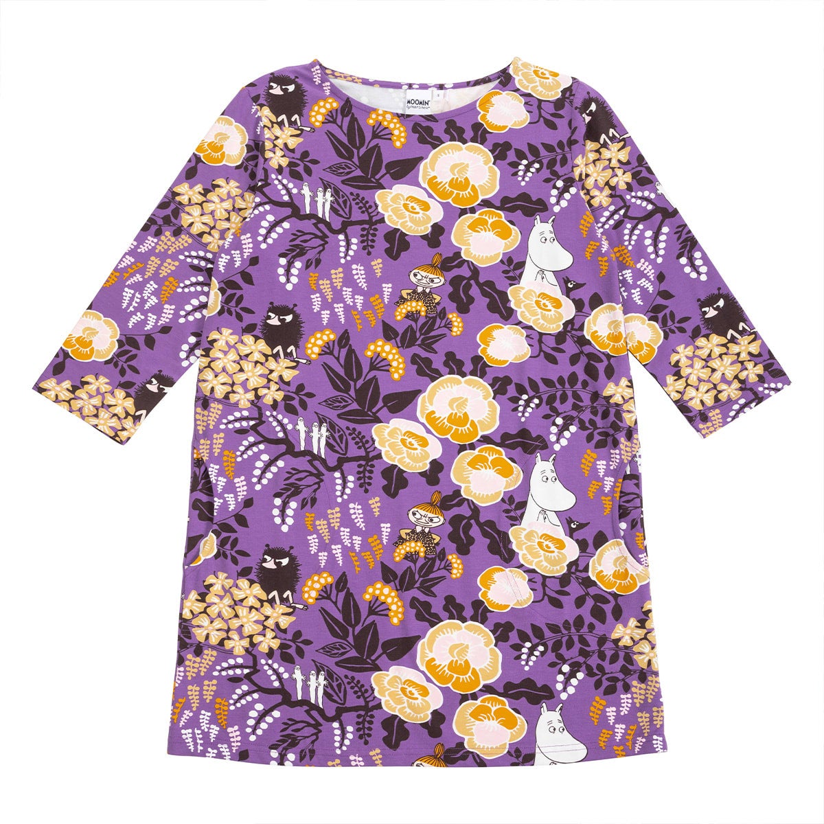 Syvän liila Muumi-mallistoomme kuuluva taskullinen tunika, jossa on ¾-hihat, taskut ja suora malli. Tunikassa on hurmaavan runsas, vaalean sävyillä leikittelevä Floora-kuosi.
